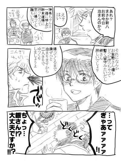 姉上がいないから家に帰る必要がなくて万事屋に泊まろうとする新八に、神楽もなんでかお登勢さんもキャサリンもいなくて、その上ストーカー(さっちゃん)も気配がなくって、二人きりな事態に激しくうろたえる銀さんとか萌えるよな~!